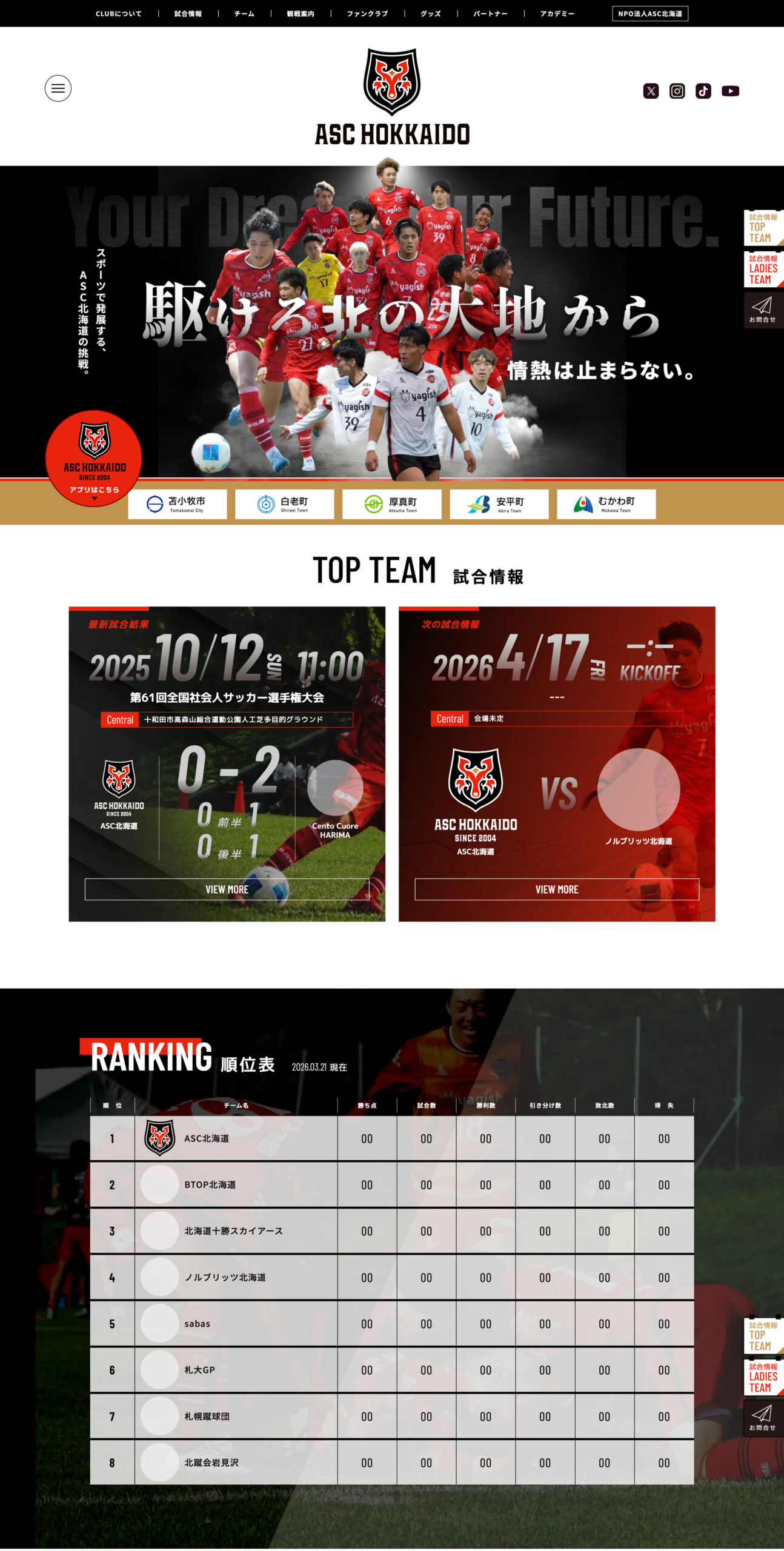 CLUBについて 試合情報 チーム 観戦案内 ファンクラブ グッズ パートナー アカデミー NPO法人ASC北海道 HOME CLUBについて 試合情報 TOP TEAM LADIES チーム TOP TEAM LADIES 観戦案内 ファンクラブ グッズ パートナー ASCパートナーメニュー ASCパートナー アカデミー NPO法人ASC北海道 お知らせ お問い合わせ NEWSお知らせ ニュースホームページをリニューアルオープンしました。 2026.03.30 本日、ホームページをリニューアルしオープンいたしました。よりわかりやすく、より最新の情報をお伝えしていきます。 TOP すべて TOPチーム レディース 試合情報 アカデミー ファンクラブ スポンサー グッズ ホームタウン ニュース その他 ニュース2026.03.30 ホームページをリニューアルオープンしました。 READ MORE > VIEW ALL ASC北海道|公式サポートショップ SUPPORT SHOP ユニフォームやグッズ購入でチームを後押し! 公式サポートショップ